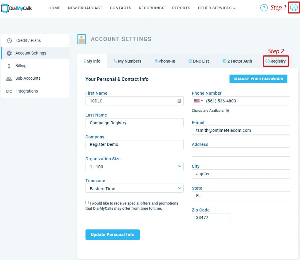 From within your DialMyCalls account you can quickly and easily register your local 10DLC number with The Campaign Registry – check out the steps below: