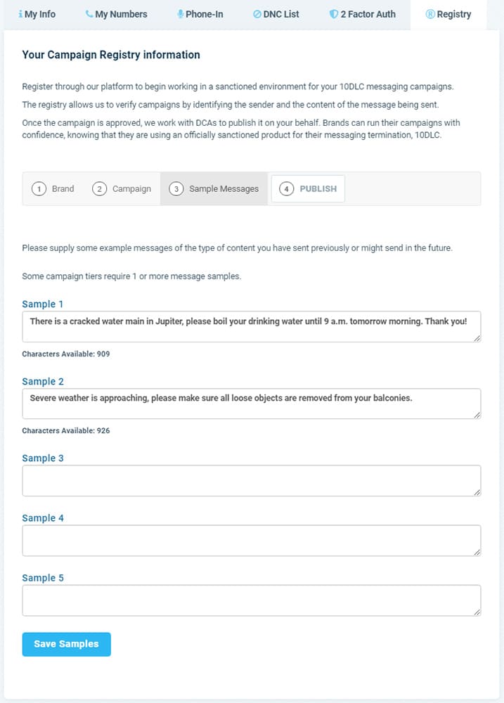 Please provide sample messages – submit the messages that you will be sending out through DialMyCalls from your local 10DLC number(s).