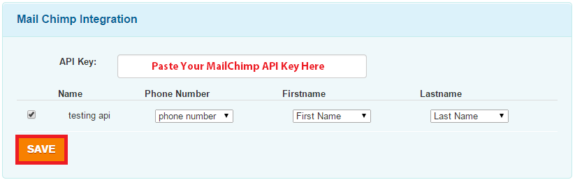Upon pasting your API Key into the form field, your MailChimp lists will immediately appear below. At this point in time you are able to select which lists you want to sync with DialMyCalls. Please choose the phone number, first name and last name fields from the dropdown menus. Once you have checked off the lists you want to sync, click on “Save”. Please note that you must have collected 10-digit phone numbers from the folks that have opted in to your MailChimp list – if there is no phone number associated with a contact it will not be imported into DialMyCalls.