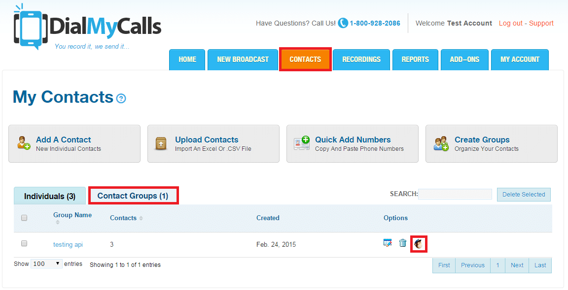 Navigate to your “Contacts” tab and then click on “Contact Groups” to see your newly synced MailChimp list(s). If you choose to delete one of the MailChimp groups it will automatically unsync that particular list and the contacts will be removed from your DialMyCalls account.
