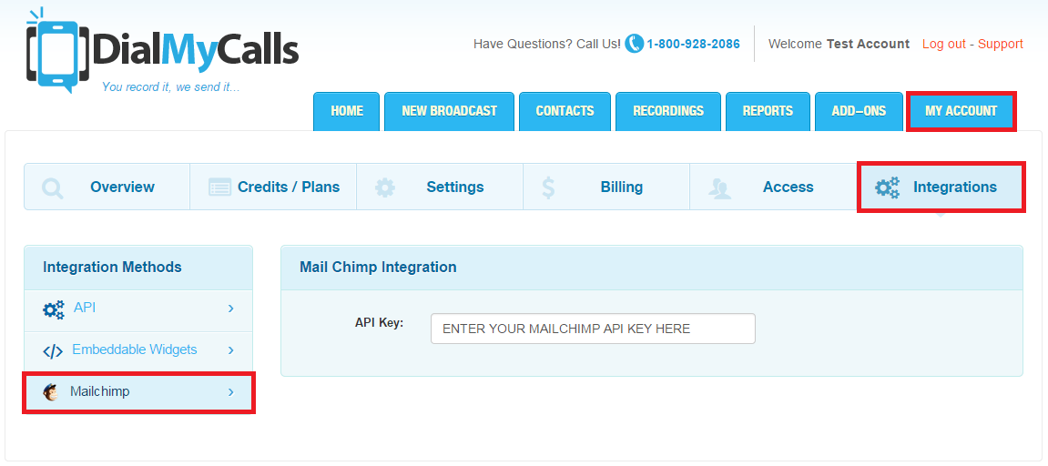 Log in to DialMyCalls and navigate to your integrations by clicking on “My Account” -> “Integrations” -> “MailChimp”. Paste your MailChimp API Key into the blank form field that appears on the integration tab.