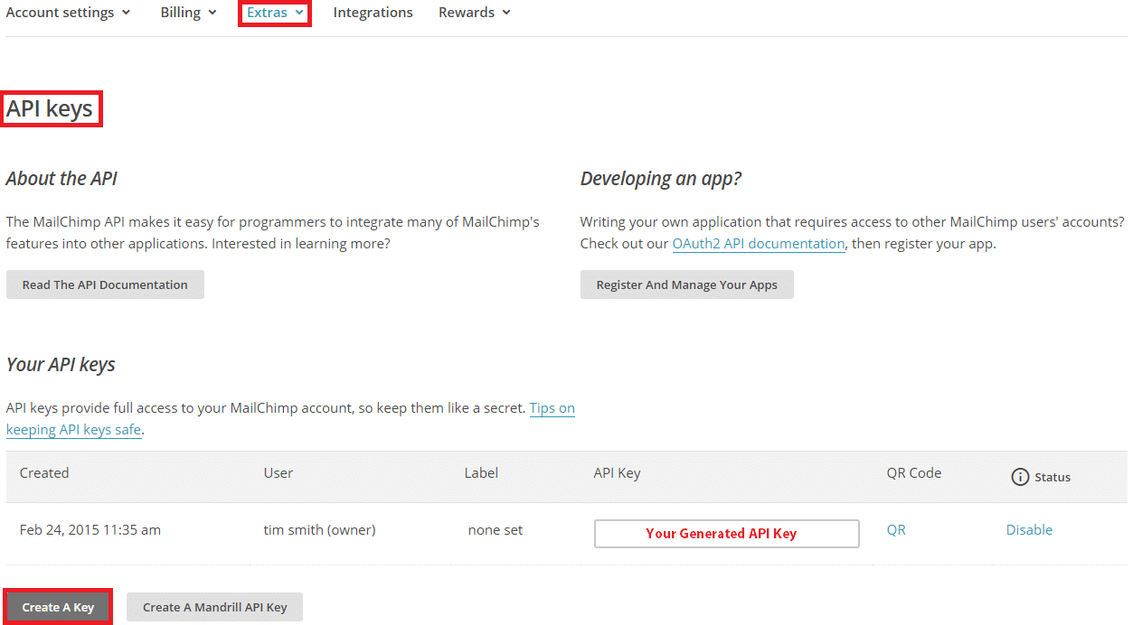 To get started with the integration, please navigate to your MailChimp account as you will need to create a unique API key that will be used to sync your lists with DialMyCalls. Once logged in, click on “Extras” and then “API Keys” which will allow you to create a new API Key as well as view any keys that have already been created. Copy your newly generated MailChimp API Key and then head on over to DialMyCalls.com.