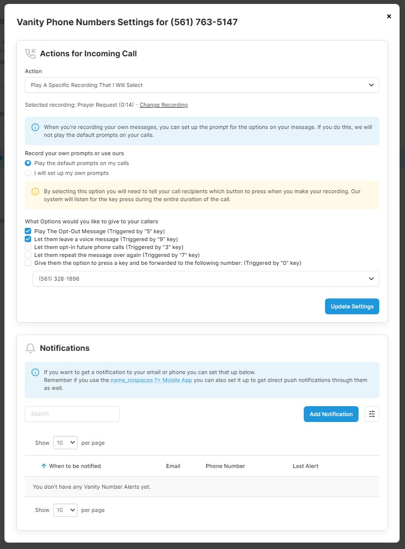 Your church prayer line is easily customizable through DialMyCalls’ web-based interface. After purchasing your vanity number you will want to go in and set it up by going through the different settings that we offer. The first thing you will want to do is set the function which as a prayer line, you will want to choose “Play A Specific Recording That I Will Select” — you will need to go to the “Recordings” tab to create the message that you would like to be played when your church members call into your prayer line. (Read More On Recording Messages In DialMyCalls Here)