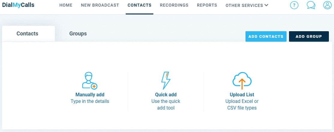 Next, you’ll need to start adding contacts to your account, so you can broadcast your messages to the right people. Click “CONTACTS” on the navigation menu. Then, you can manually add contact details, upload an Excel or .CSV list, or use the “Quick Add” Tool to quickly add multiple phone numbers.