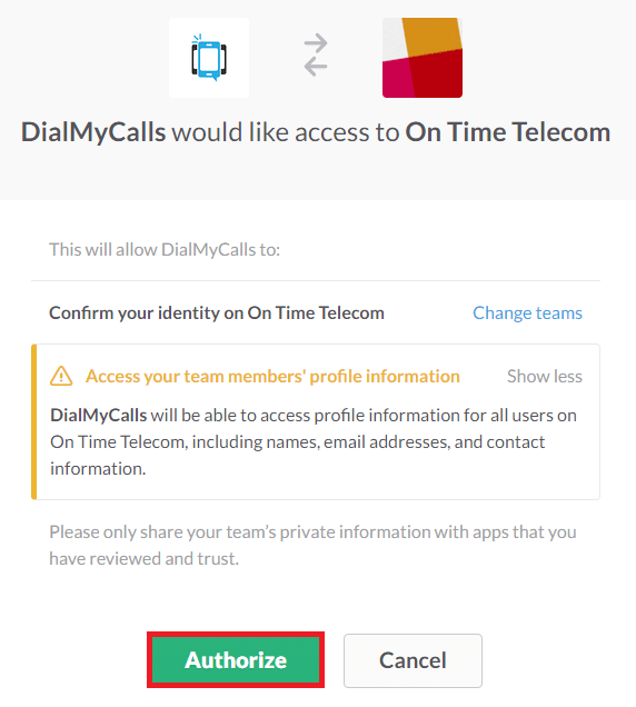 An authorization screen will appear asking if you would like to allow DialMyCalls to access your Slack account – click on the “Authorize” button to proceed.