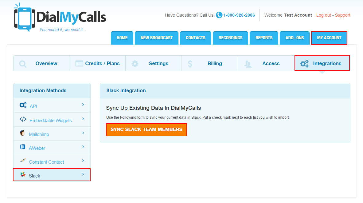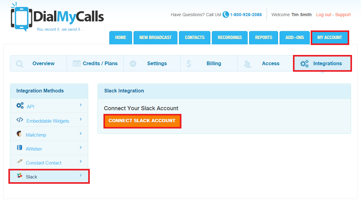 Now you are going to want to login to your DialMyCalls account and navigate to the Integrations tab. Click on “My Account” -> “Integrations” -> “Slack” and you will then want to click on “Connect Slack Account” to authorize DialMyCalls to access your Slack contact information.