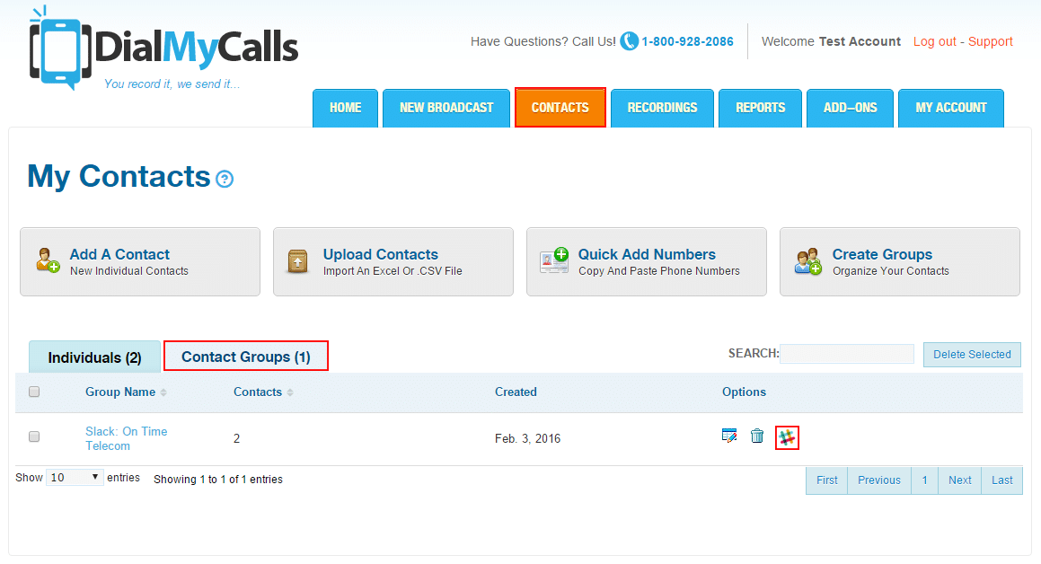 Your Slack team members that were successfully synced will now be listed under the “Contacts” tab in your DialMyCalls account. A new contact group will be created with the name “Slack: [Your Slack Team Name]” and all synced contacts will show a Slack logo next to their entry.