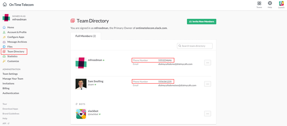The only requirements to utilize this integration is to have an account with both Slack as well as DialMyCalls. The first thing you will want to do is login to your Slack account, click on “Team Directory”, and make sure all of your team members have a 10-digit phone number attached to their profile – this integration will not work if there are no phone numbers present.