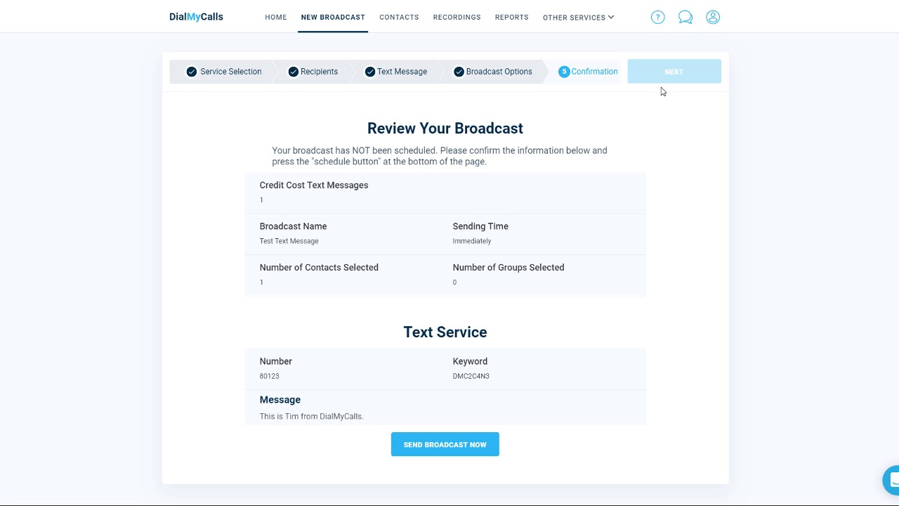 Confirm the information for your newly created text message is correct and then click on "Send Broadcast Now".