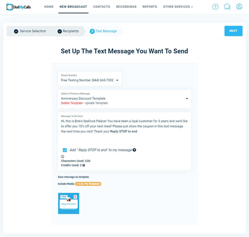 - Supported content: Rich media (images, video, GIFs) *DialMyCalls currently supports photos, not videos.