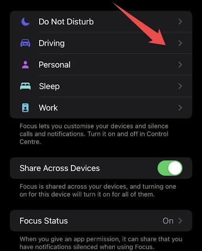 4. If you can’t find this option, click the + sign at the top right corner of your screen, select the Driving option, and click Customize Focus.