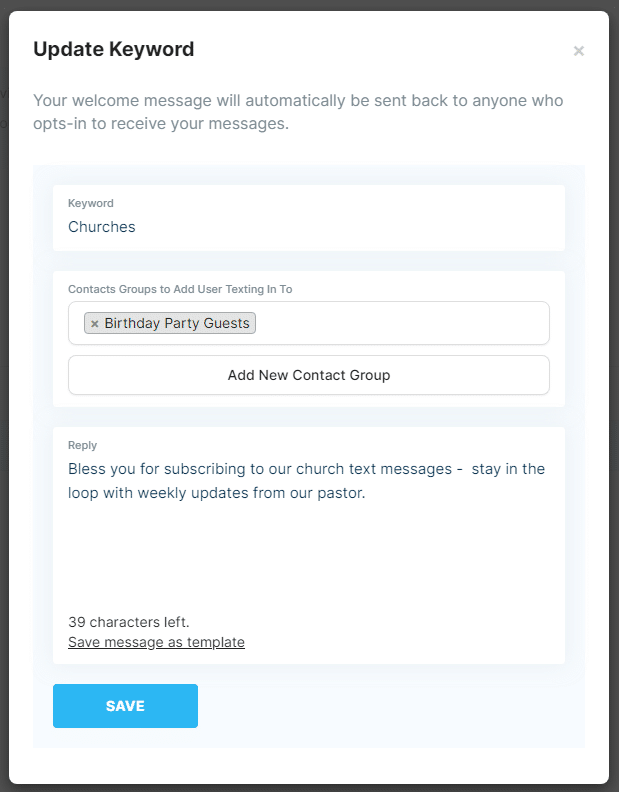 In addition to being able to text “START” to your vanity number, you also have the ability to register a keyword for that number. Keywords will allow you to customize your opt-ins and create personalized auto-replies for each keyword. Once someone texts “YourKeyword” to your vanity number then they will receive your custom auto-reply. You can also have your account set up so that it adds those opt-ins into a specific contact group.