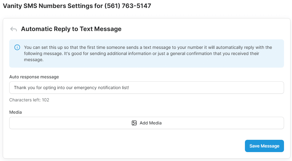 The vanity number you receive when you sign up for a DialMyCalls account has the ability to send auto-replies. Once someone opts into your vanity number by sending “START” to that number then they will receive a custom message in return. With DialMyCalls you can even attach an image to your auto-reply and send out an MMS when someone opts in. Easily see messages sent to your vanity number with the 2 way texting feature.