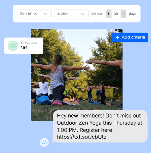 Generate groups to text based on criteria, like new members and other demographics.