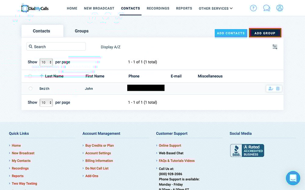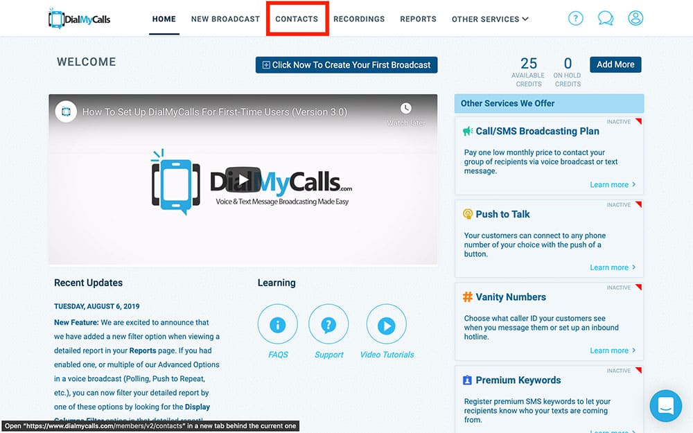 Log in to your DialMyCalls account and choose Contacts at the top of the screen: