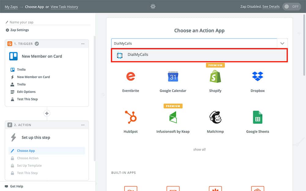 Now it’s time to create your DialMyCalls Action. Your Zap’s Action is what your Zap is actually going to do when it runs. You can add as many Actions as you like, though in our case we only need one.