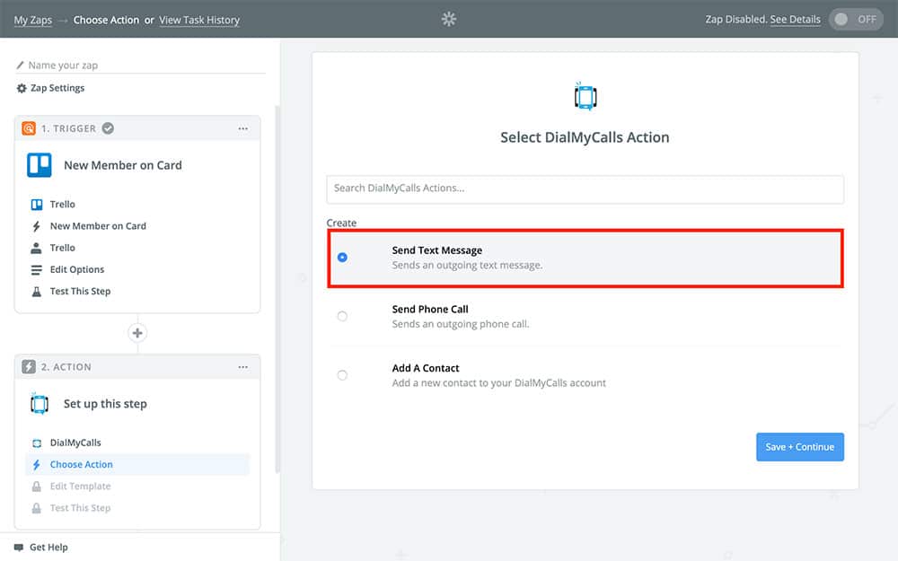 On the next page, you’re going to choose what DialMyCalls does when this Zap runs. In this case, we want to send a text message – so, go ahead and choose that from the available options:
