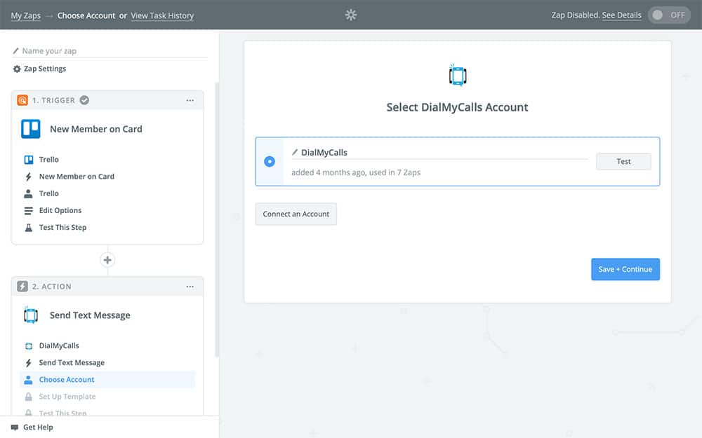 After that, you’re going to connect your DialMyCalls account to Zapier. If you’ve already done this, you should see it listed as an available option. Otherwise, choose Connect an Account and follow the onscreen instructions: