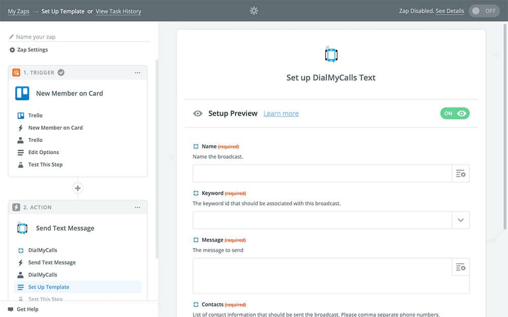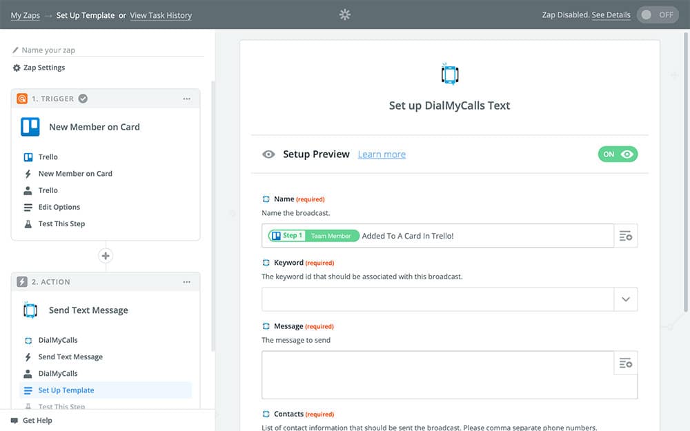 With your DialMyCalls + Trello Zap activated, it’ll be much easier to let members of your team know when they’ve been assigned new projects and the rest of the team know who’s working on what. You can send notifications for other Trello events as well, which would allow you to keep everyone in the loop on everything important, automatically!