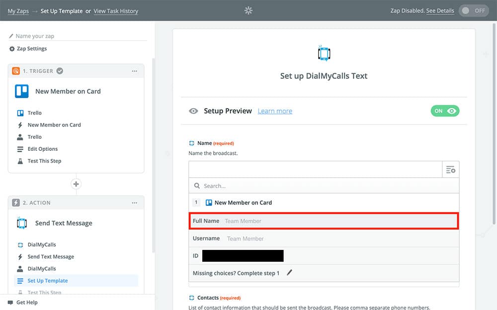 This is where we’re going to specify exactly how that text message your sending looks. The first field, Name, is going to be the name of the message you’re sending. You can name it something like, “Team Member Added To Trello Card,” and all of your notifications sent via this Zap will be called that. For something a little more unique, though, you can use the Full Name variable from the dropdown menu so that each notification will be named after the member being added to a Trello card, like so: