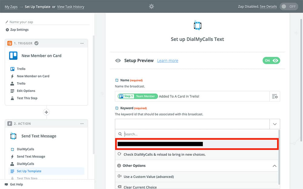 - Told our Zap to send out a text message notification to our Trello team letting them know which member was added to a Trello card