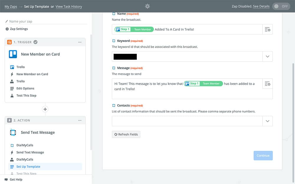The last field your going to fill in is the Contacts field. You’re going to need to add each contact you want to send a notification to one at a time, which is where the group we created in the first step comes in handy. If you only choose one contact, they’re the only person who is going to receive these notifications. So make sure you include the phone numbers of every member of your team, or at least the ones you want to be notified. And remember that if you add new members to your Trello team, you’ll need to add their numbers to this Zap as well for them to be notified.