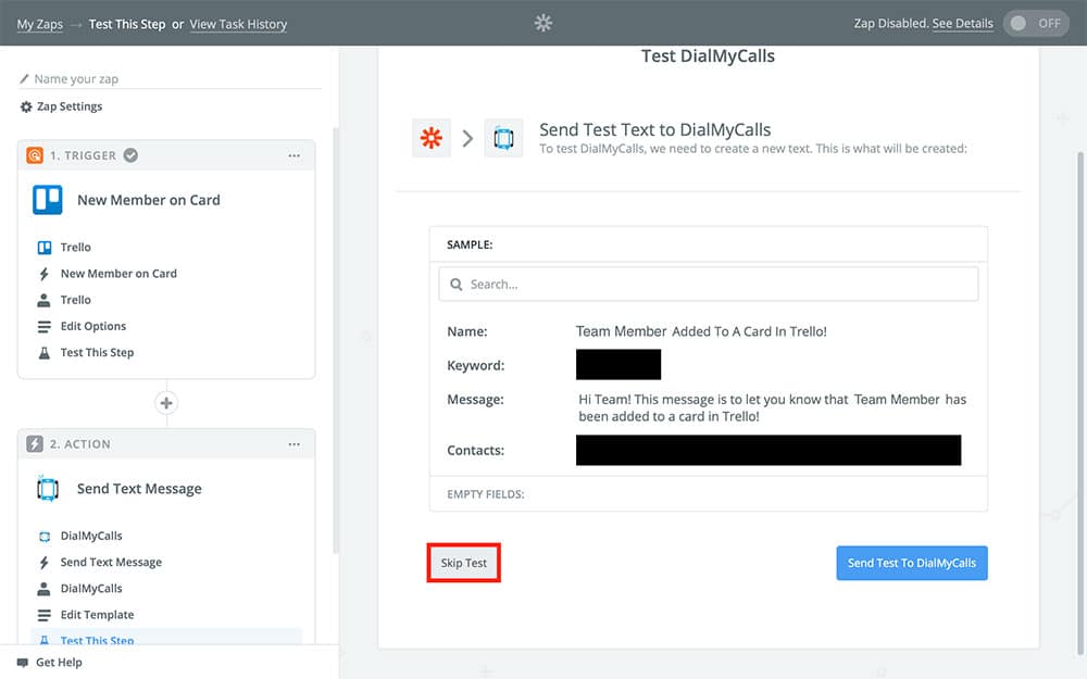 Directly after that, Zapier will ask you if you want to test this Zap. You can if you like, but keep in mind that doing so will send a text notification to your Trello team with the sample you chose in the beginning. If you don’t want to do to this, feel free to choose Skip Test: