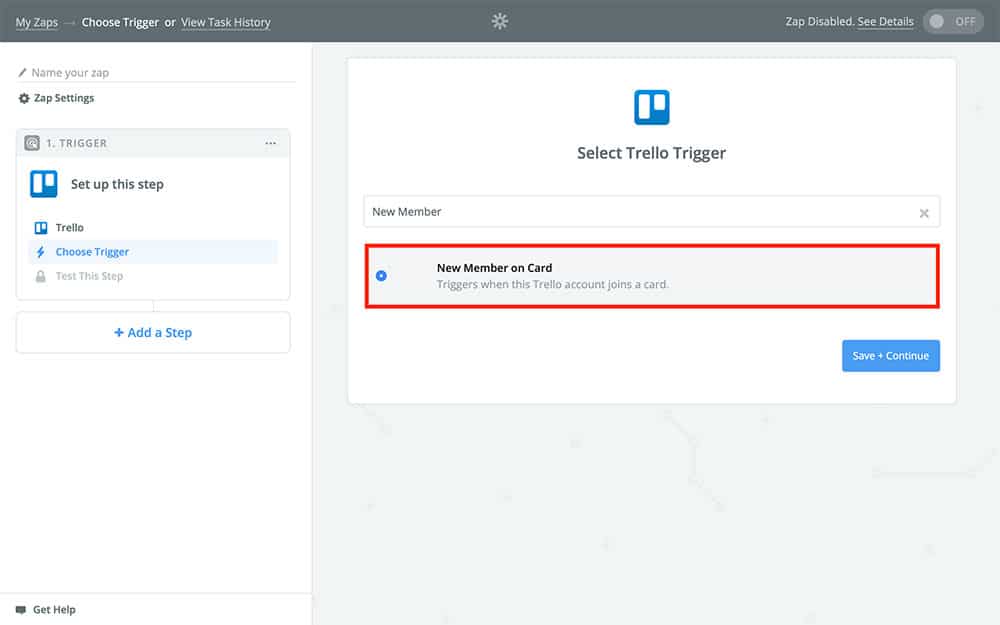 After that, select Continue. On the next page, you’re going to choose the Trello event that triggers this Zap. In our case, we want this Zap to run every time a Trello member is added to a Trello card. You probably won’t see this option listed, however, so go ahead and type “New Member,” into the search field and select New Member on Card when it appears: