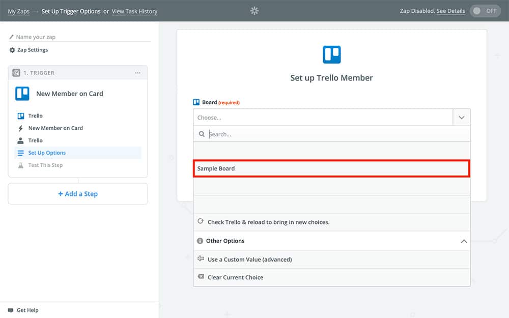 After that, you’re going to choose a sample for your Zap. Your sample is just a random Trello member that is going to be used to fill in the rest of the Zap, so don’t worry over which member you use too much: