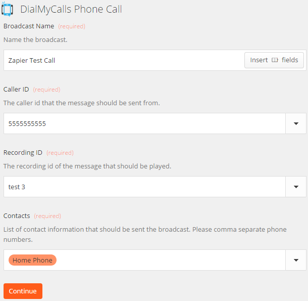 Create a zap that will allow you to select a trigger from your favorite app and then have DialMyCalls send out a voice broadcast. From within Zapier you are able to name your broadcast, set the Caller ID that will be displayed on your recipient’s phone, select a pre-recorded message*, and then select the contact from the trigger app that will be sent the broadcast. *You must log into your DialMyCalls account to verify a phone number to use as the Caller ID and create the recording that will be sent out.