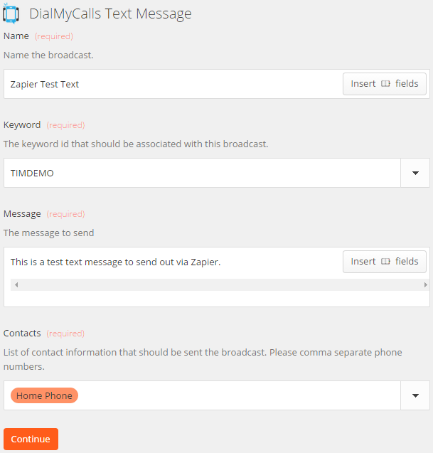 With your trigger app selected you can setup the text message action that will utilize DialMyCalls. Let’s say that you are using an eCommerce app available through Zapier and would like to send your customer a text message (action) when they complete a purchase (trigger). Zapier will allow you to select the eCommerce app as the trigger and then you can set up the SMS broadcast that will go out as soon as that trigger occurs. You are able to create the name for your broadcast, select your DialMyCalls Keyword, type out your text message that will be sent and then you can select the phone number field from your eCommerce app. Once this Zap is created, it will automatically send out a text message to your customers when they complete a purchase!