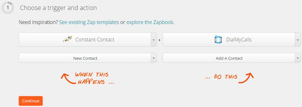 Once you have logged into Zapier you can “Make A Zap” which will allow you to select the app you are wanting to integrate with DialMyCalls. There are two choices when creating a new zap, a “Trigger App” and an “Action App” – DialMyCalls will always be the action app.