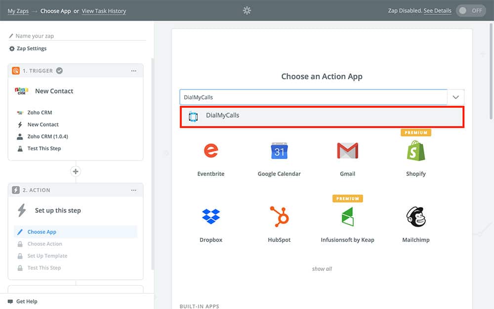 Now it’s time to create your DialMyCalls Action. Your Action is what your Zap is actually going to do when it runs. To get things rolling, type “DialMyCalls,” into the search field and select it when it appears: