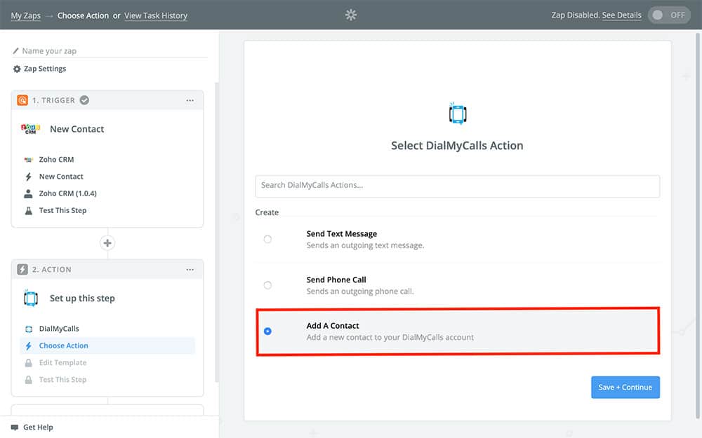 Next, since we want to keep our Zoho contacts backed up to DialMyCalls, you’re going to choose Add A Contact for your Action: