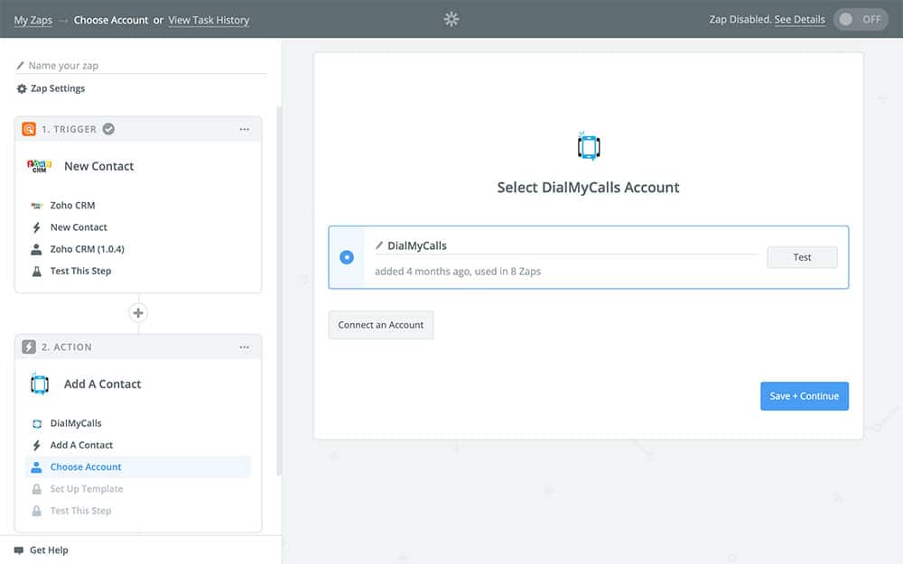 After that, just like with Zoho, you’re going to need to connect your DialMyCalls account to Zapier. If you’ve already used DialMyCalls with Zapier, you should see it already listed. Otherwise, you’ll need to click the Connect an Account button and follow the onscreen instructions: