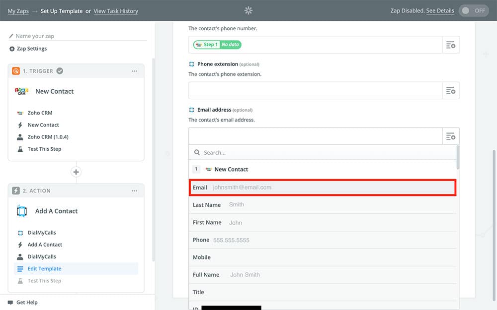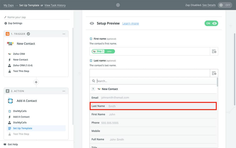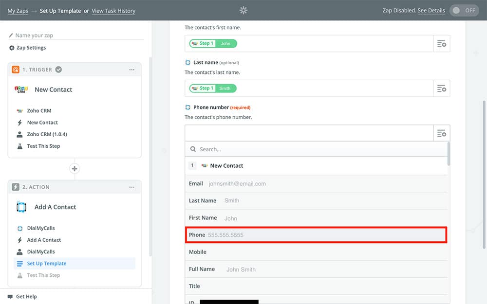 You can find variables for each field in the dropdown menu to the right. These variables will change every time your Zap runs depending on the contact being copied from Zoho to DialMyCalls. In other words, they’re pretty cool.
