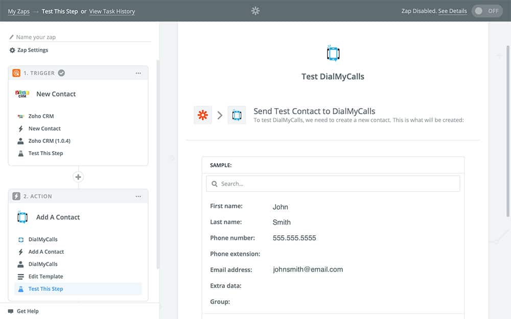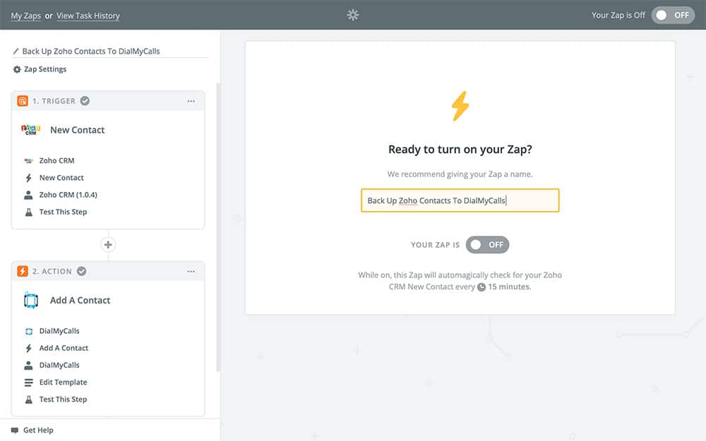 Just keep in mind that once you flip that green switch all of your new Zoho contacts are going to be copied to DialMyCalls from here on out – until you switch this Zap back off, of course.