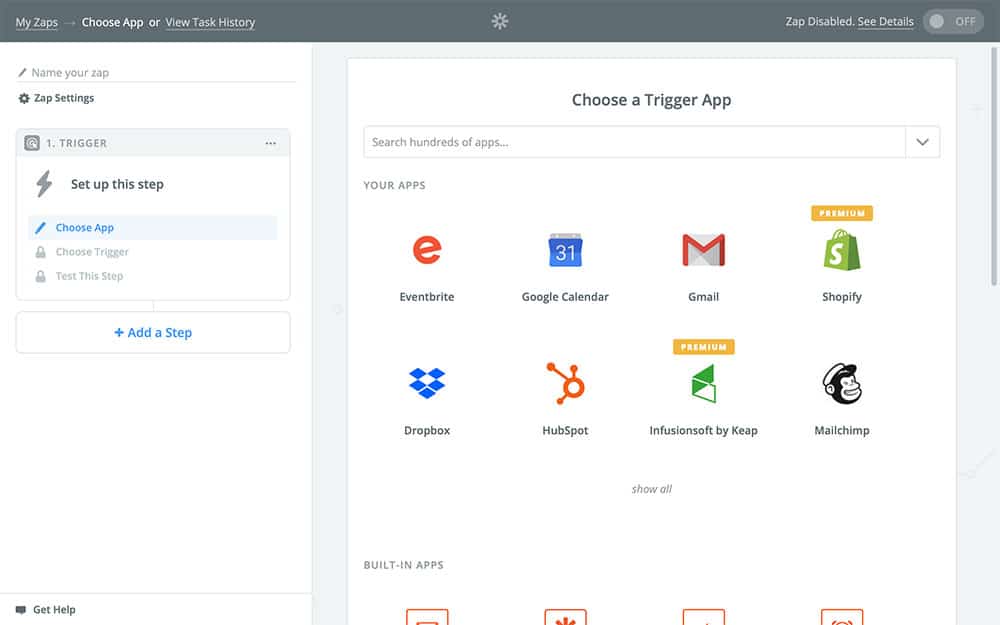 See the orange Make a Zap! button in the top right? Push it! This will bring you to the Zap creation screen, which is where things start to get interesting.