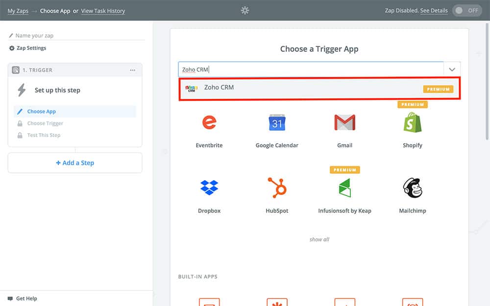 This is where you’re going to select the first app, Zoho. In the search field at the top, type in “Zoho CRM,” and select it when it appears: