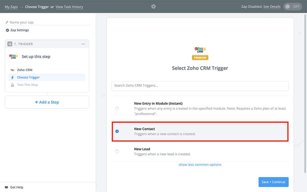 Next, you’re going to pick your Zoho Trigger. Your Zap’s Trigger is what tells it when to run – every time it happens, this Zap will do its thing, automatically. In our case, we want this Zap to run every time we get a new contact in Zoho, so pick New Contact:
