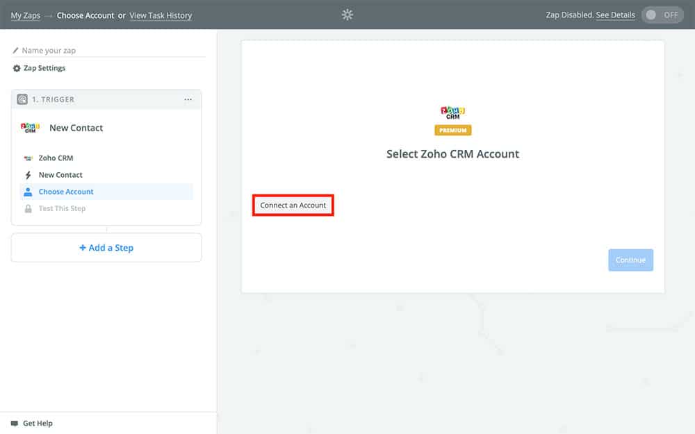 Next, you’re going to need to connect your Zoho account to Zapier. If you’ve already used Zoho with Zapier, you can just press the Continue button. Otherwise, select Connect an Account: