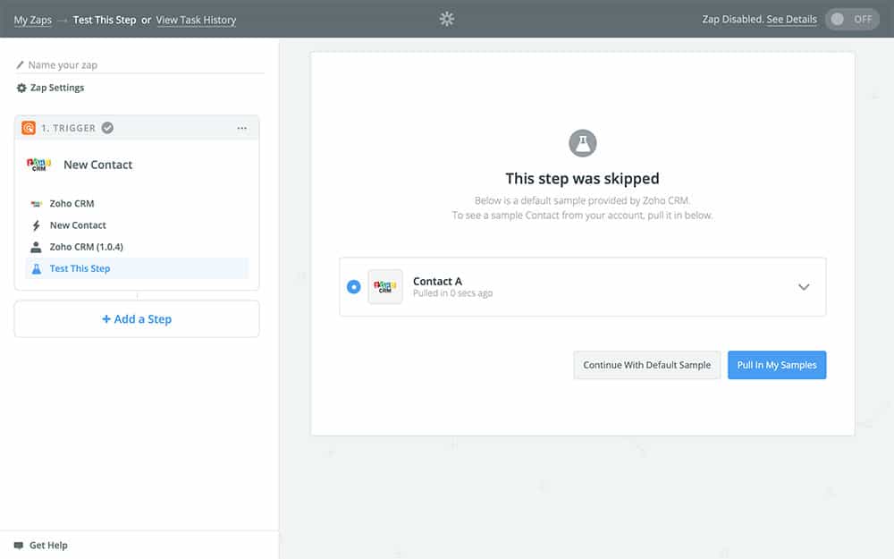 Next, Zapier is going to ask you for a sample. A sample is just a real or randomly generated contact from your Zoho account that will be used as a placeholder later in this Zap. It won’t actually be used when the Zap runs, though, so it doesn’t matter which sample you choose: